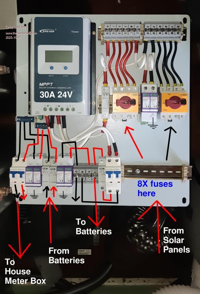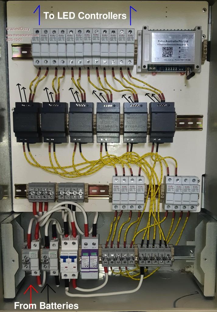 ![]() I have chosen to have my solar isolation switches inside a weather protected meter box, knowing some nob head in Canberra once said they should go on the roof. Recently said nob changed their mind and said we can now have them where a human can reach them...not realising that over time these switches ingress water so same nob said that we now have to put on an umbrella for these switches. Mine goes in a meter box. MCB's are non-polar and act only as a switch to disconnect battery sources. ...waiting on a bunch of fuses and ferrules as run out, so not wired yet :P Edited 2025-10-01 15:12 by CraziestOzzy http://cr4.globalspec.com/member?u=25757 http://www.instructables.com/member/OzzyRoo/ |