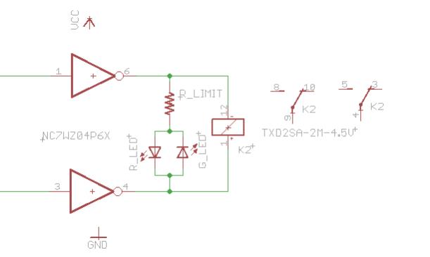 Hi Quazee137; Well there is the 33.3mA. This has to go somewhere. In this case it will pass through the output MOSFETs on the gate. Since the NC7WZ04P6X is a normal gate, (Without Tristate), one of the two outputs in each gate will always be ON. This circuit is essentially a full-bridge. OK, I see what you are trying to do here. 1. Pulse HIGH to switch the relay one way, and charge the capacitor. 2. Pulse LOW to switch the relay back, and discharge the capacitor. There is a problem though: This opto-isolator doesn't have any catch diodes across the NPN output. I would suggest adding 1N4148, or the like, to direct the kickback current to the supply rails.This should work fine, assuming the 2 diodes are added. redrok |