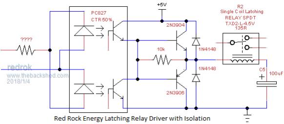Hi Quazee137; Here is your circuit with a current amplifier half bridge. ![]() The problem with your first version is the OptoIsolator requires much to high of a drive current to properly switch the relay. The PC827 has a CTR, Current Transfer Ratio, of 50%. This one has a current booster so maybe only 5mA of Opto drive is required. I also added the catch diodes. The optional 10K resistor assists in fully charging and discharging the cap. There is one quirk with this circuit. Unlike my 2 capacitor circuit, above, which fully charges the capacitors even with no drive applied this circuit leaves the capacitor free floating when no drive is applied. So if the capacitor has some leakage it might self discharge. The solution is to send a dummy, or redundant, switching action the same as the last action performed before switching to the new position. Have fun!!! redrok |