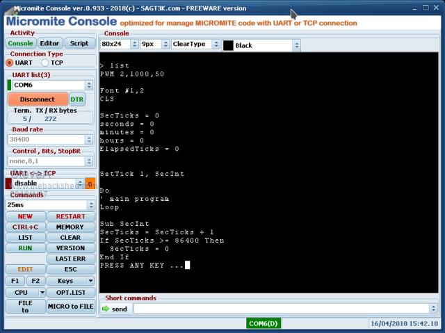28 pin Micromite (MX170) -> CP2101 USB to Serial adaptor -> Dell P22T Chromebook dmesg shows cp210x attached to ttyUSB0 or 64 pin Micromite+ (MX470F512H) -> Chromebook dmesg shows Product: Micromite Plus, Manufacturer Silicon Chip ttyACM4: USB ACM device Software versions: Chrome OS 66.0.3359.79 Ubuntu 16.04.4 LTS Wine 1.6.2 |