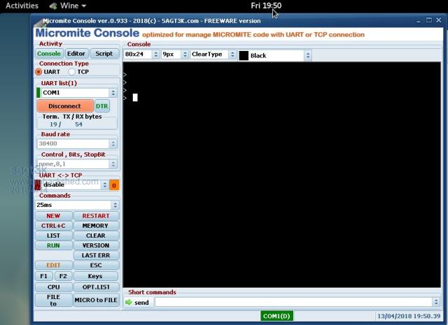 I now have MicromiteCons working, see the screenshot below: ![]() It wouldn't run on Wine v1.6.2, but it will under v3.0. To update wine in Ubuntu use: sudo dpkg --add-architecture i386 sudo apt-add-repository 'https://dl.winehq.org/wine-builds/ubuntu/' wget https://dl.winehq.org/wine-builds/Release.key && sudo apt-key add Release.key sudo apt update && sudo apt install winehq-stable |