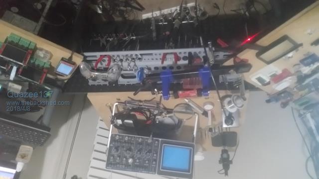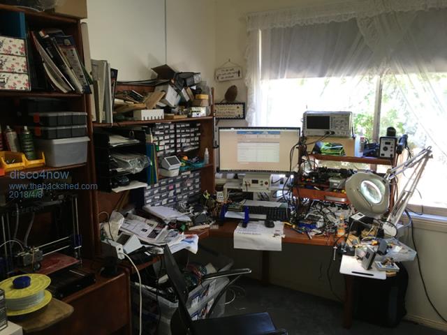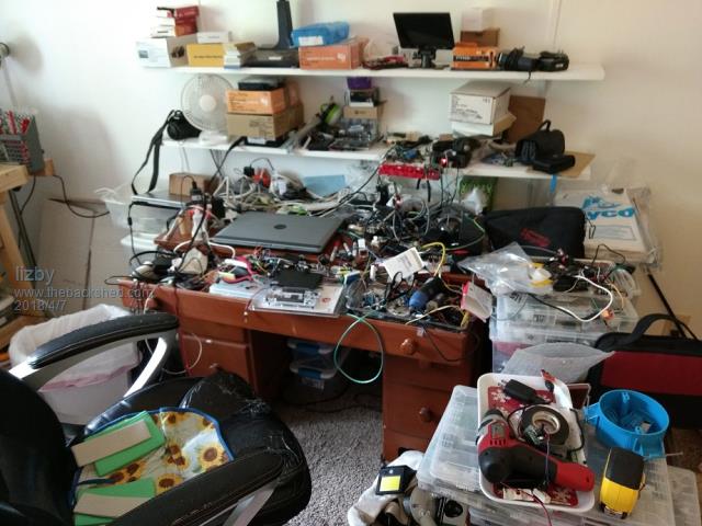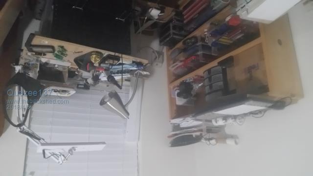 Well that explains why his is messy, everything keeps falling off the table and landing on the ceiling LOL Wish I had some pics of my old workshop, at present its a bit of cardboard on my bed (staying at my sisters place) so nothing really to photograph unless you want a pic of my soldering iron on the floor and my workbench' ie an old carboard box from bunnings- for those 'really' interested- the box used to contain rolls of whipper snipper cord... All the rest is in storage, and I miss it.... |