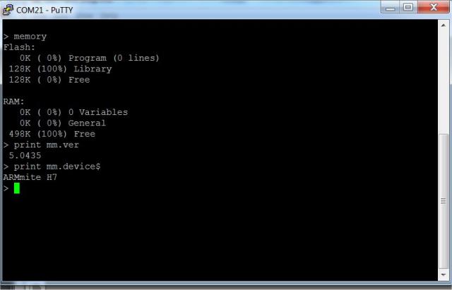 Removed H7 from the package for the first time, set up jumpers and solder bridges, plugged it in, got the folder pop-up, copied in the .bin file, started puTTY, and voila, success! Thanks much for all of your work. ![]() PicoMite, Armmite F4, SensorKits, MMBasic Hardware, Games, etc. on fruitoftheshed |