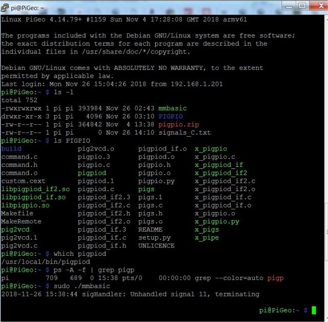 I downloaded 2018-11-17_085257_mmbasicstetch.zip and put mmbasic on a raspberry pi zero w with latest raspbian stretch lite (installed yesterday). When I run "sudo mmbasic", I get "SigHandler: Unhandled signal 11, terminating", and a return to the "$" prompt. I'm connected to the pi headlessly over wifi with puTTY. At this point, what I type does not appear, but if I type a linux command and hit enter, it runs. I have to reboot to get typing at the linux command line to appear. I'm not running pigpiod, as shown by "ps -A -f | grep pigp". I followed instructions and made pigpiod v68--location shown by "which pigpiod". I could not cut and paste from the puTTY window after the SigHandler error. There is a screen shot below. What do I need to do? ![]() PicoMite, Armmite F4, SensorKits, MMBasic Hardware, Games, etc. on fruitoftheshed |
