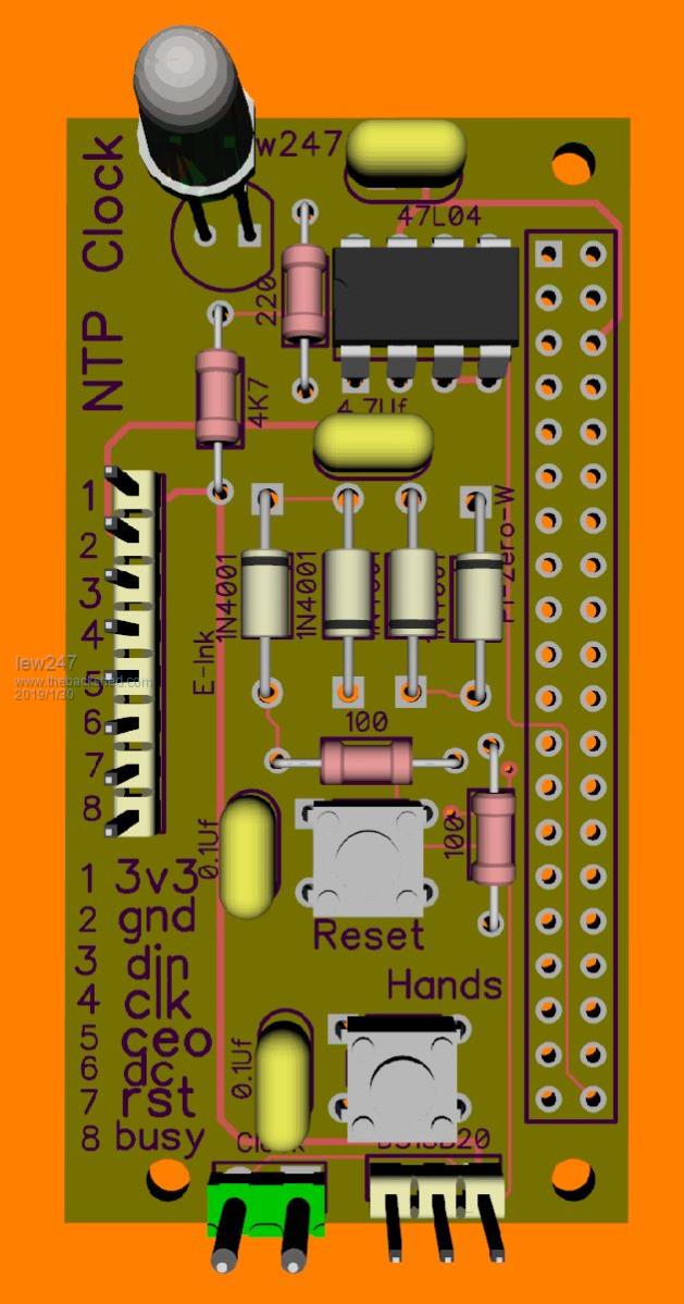 Sorry The time difference is annoying at times, and I am jealous of your weather down under it's snowing here now It's an analog clock that I'm running from a Pi Zero W and I've made a slight change in the Pi code to get proper NTP time from my local NTP timeservers every 15 minutes so the time is always exact without any fancy code in the MM The issue I had was moving the hands properly, the motor moves 1 pulse (second) by applying a positive voltage pausing then a negative voltage to move the next second It was driving me potty because it was moving 2 seconds for every real second until I realised that I was actually telling it to do exactly that - stupid mistake! It's working perfectly now and I've had it running for a few days with no errors Thanks Brian for your "NOT" idea, it actually reading that when I realised that I was telling the code to move 2 seconds for every real second. I've designed the board so it also has a temp sensor and a connection for an E-Ink display to display the Day and Date and temperature (but doesn't have to be used) The board below shows a button to move the hands manually if you ever need to but I've removed it in the final PCB I'm using an Sram that HAS to be set to "00000" when the board is first powered up, and then the clock code loaded Move the hands manually using the wheel on the back of most clock modules or moving the minute hand only to 12:00:00 Power up and it will start ticking fast till it catches up with the current time and then once per second If there is a power cut then the Sram writes to it's internal Eeprom and this is the position of the hands in seconds. Once power is reapplied, this figures is transferred back to the Sram, read and then the hands will move fast until it catches back up to the correct time. I haven't worked on the E-Ink code yet as I blew my first display by using 5V when the maximum voltage is 4V Hopefully I'll be able to get it working tomorrow when I'm off work next The board fits perfectly on top of a Pi Zero W and is a tiny bit wider to allow the pinouts for the E-Ink to be shown It also has a "heartbeat" LED so you can see it working I've used a 2.54mm pinout for the DS18B20 so it can be mounted off the board and anywhere on the clock away from any heat The reset button isn't really needed but it's there in case someone really messes up the hands while the clock is running, it will reset the Pi totally, the power can then be removed, the Sram written with "00000" again and then the MM code loaded after moving the hands to 12:00:00 again Once I'm happy it all works ok and no issues, I'm going to use a different chip such as ATTINY85V-10SH with an Esp8266 or possibly a receiver to pick up the MSF/DCF/Wghatever radio signal This would allow it to be run from an "AA" for at least a year or more, or even a "C" for a few years The other option is once Matherp is happy with his Armite L4 code to use that with a receiver which although won't be such low power as the other chip, it should still allow the clock to run for a very long time on battery And the E-Ink display can always show the battery voltage as well if wanted so it will be easy to see when it needs changing |