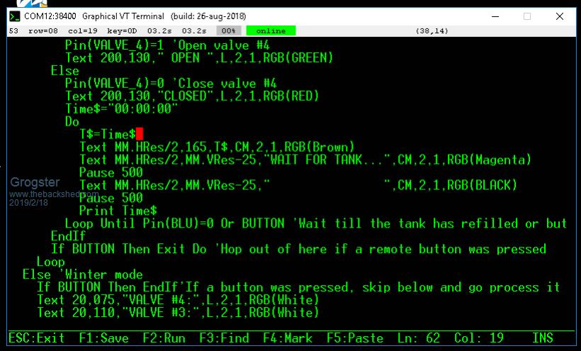 I don't follow this at all..... ![]() My code is: This DOES NOT work. The clock never moves past 00:00:00, despite the 'Wait for tank' message flashing away there happily. The background RTC - having been reset in the line before the DO/LOOP, should now count up - it does not. If I run this test code right at the top of the program: Time$="00:00:00" DO Text MM.HRES/2,165,TIME$,CM,2,1,RGB(BROWN) Text mm.hres/2,MM.VRES-25,"WAIT FOR TANK...",CM,2,1,RGB(White) Pause 500 Text mm.hres/2,MM.VRES-25," ",CM,2,1,RGB(BLACK) Pause 500 Loop It works exactly as expected, and the timer counts up on the LCD. But the code above - which is essentially the same - does not. If I CTRL-C break the program when it WON'T count, then quickly ask for a '? TIME$', it is only counting from the point I CTRL-C stopped the program, so it is like resetting the time$ inside a loop(but only once) is not taking effect.... Can anyone help with this, as I don't understand what I am doing wrong. Smoke makes things work. When the smoke gets out, it stops! |