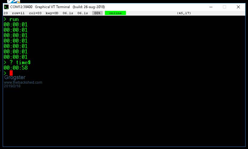 PRINT Time$ added to DO/LOOP - never makes it past 00:00:01 CTRL-C break, then ? Time$ - 00:00:06, so the RTC is ticking again, but only AFTER you CTRL-C break the running code - inside a loop which, does not clear the RTC, so it SHOULD be ticking.... I will now try the T$ idea. EDIT: Results from adding a 'PRINT Time$' to the loop: ![]() Results of saving Time$ to T$ first is EXACTLY the same - the RTC never moves. The extra code I added was: T$=Time$ which is now the first line in the DO/LOOP with the blinking tank message: ![]() EDIT: Run the code for 7 seconds, RTC never moves past 1s. CTRL-C break, wait a little, ask for the time$: ![]() This is really odd..... ![]() Smoke makes things work. When the smoke gets out, it stops! |