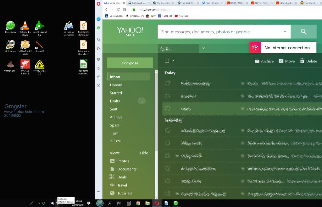 I have censored all the email messages for privacy, but you can see the "No internet connection" message in the web browser, and the "Internet access" message on the network taskbar icon.