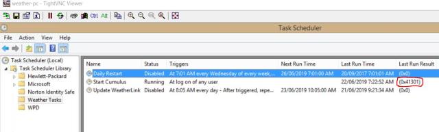 Hi Jim, Tried all that; tried having Task Scheduler launching a batch file instead or running commands... All attempts appear to have a looping issue on subsequent launches. That's where I reckon it's somehow related to the (0x41301) status that the Scheduled tasks sit in. That's the "Still Running" state. I reckon I need to have it get to the (0x0) state, completed, before doing other stuff. Re Cumulus taking a long time to exit; I've notice a huge improvement in that issue in the latest releases. Not sure if you are aware, but since Steve (Author) retired a back in 2017, circa V3046, the software is now being supported & developed again. Steve released the source code in Dec 2018 & it's now being updated again. Mark Crossley is heading that up now. He's the guy that's been responsible for the code for gauges & graphs etc. His latest release is v3050 & was posted 1'st May 2019. Cheers Phil. |