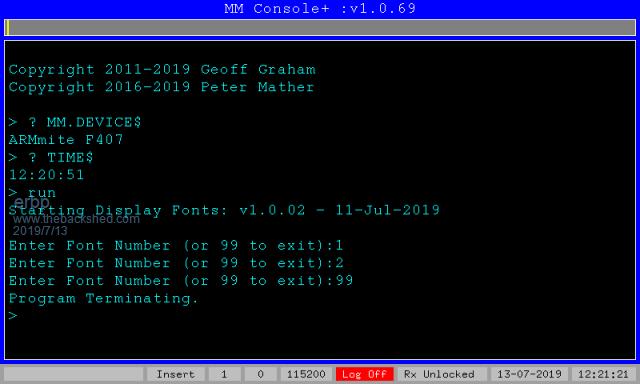 The following are details of the project I have just completed, which may be of interest to some. It is using one Micromite as the Console for any other Micromite that it is connected to. This project came about as I didn't have a PC located in my workshop, so I found I was spending more time moving MM's, modules, test equipment, power supplies, etc., from the workshop to where the computer is located (and back again) than I was in productive development and testing. I thought - "why not use a Micromite to act as the Console, why do I need a computer, after all it just needs a serial comms link?" So after a small proof of concept project was successful and I got quite excited about the idea of not needing a PC to do many of the tasks related to "doing MM stuff", the MMConsole Plus (MMConsole+) project was born. Although I now have a computer in the workshop, I find I only use it for loading firmware to Mites, major development coding, reading TBS and the occasional Googling to get the answer (or not) to a vexing question. I much prefer to use MMConsole+ to work with other Mites. Below is a screen shot of one of the main screens of MMConsole+ acting as the console for a connected ARMmite F4 and running a few commands, including initiating a program that I had just uploaded to the F4 via MMConsole+. ![]() Below is a slightly reformatted extract (in blue) from the first couple of sections of the MM Console+ User Guide document included in the attached release package. This gives more high level detail on functionality and hardware requirements. If you feel this might be something that you would be interested in, the User Guide provides a lot more details including over 20 screen shots. Introduction MM Console+ is a MMBasic program designed to run on a Micromite Plus device and provide Console and related functionality when connected to any other Micromite device thus replacing the need to connect to a PC to act as the Console. In this document, the Micromite Plus device running the MM Console+ program will be referred to as the Console MM while the Micromite device whose console it is connected to will be referred to as the Target MM. Specifically, it provides the following functions: 1. Basic Console Access - i.e. the ability to enter MMBasic commands at the MMBasic Prompt on the Target MM and to display output messages received from the Console of the Target MM. 2. Console Logging - all console messages can be logged to a log file stored on the SD Card of the Console MM. Logging can be enabled/disabled at any time and new log messages can be appended to an existing log file if desired. 3. Console Log File Viewing - the contents of an existing log file (must be a log file created by MM Console+) can be viewed and scrolled through as well as searching for occurrences of a specific word or text string in the log file. 4. Lite Editor - provides limited editing capability for MMBasic program (.bas) files stored on the SD Card of the Console MM. The editor is intended for small tweaks, corrections and similar maintenance type activities, it is NOT intended to support full-blown program development from scratch (refer to the Lite Editor section in the User Guide document for more details). 5. Program Crunch - provides the ability to "crunch" an existing MMBasic program file stored on the SD Card of the Console MM. The "crunched" file is saved with a different name so it does not overwrite the original source file. Statistics for the crunch process are displayed, including the % of file space saved, the file size of both original source and crunched files (in number of lines and in bytes), as well as the elapsed time taken to perform the crunch process. 6. Program Upload - a MMBasic program file stored on the SD Card of the Console MM can be uploaded to the Target MM. This uses the XMODEM RECEIVE method. Optionally the file may be Crunched as part of the upload process, with the crunched version of the file also being saved, as well as the crunch statistics (as described above) being displayed. Important Notes: 1. MM Console+ is NOT a VT100 Terminal Emulator and as such is incompatible with the MMBasic Built-In Editor function (the EDIT command is not supported and will not be allowed to be sent to the Target MM). However, the Lite Editor within MM Console+ does provide somewhat equivalent functionality with some additional flexibility and features. 2. MM Console+ cannot load the MMBasic firmware to a Target MM device - this still requires a PC with PICkit, Microbridge or 1455 interface module. Hardware Requirements CPU MM Console+ is designed to run on a Micromite Plus (MM+ / MX470) device. Either the 64 or 100 pin variants are acceptable. It will probably run on the more powerful devices (MMX, ARMmite F4, ARMmite H7) but none of these have been tested, and some source code modifications would be necessary. It will NOT run on Micromite MkII (MM2 / MX170) or ARMmite L4 devices. KEYBOARD An external (PS/2) keyboard is required. LCD A screen with a minimum resolution of 800 x 480 is required. Touch is not used by MM Console+, however the screen can support it and it can be configured without any adverse effects. SD CARD Access to an SD Card is required. This may be using the SD Card interface on the back of the LCD or a separate SD Card holder connected to the appropriate pins (e.g. CON10 of the E100 board). BUZZER A Piezo Buzzer (as optionally fitted to the E100) is not required but is HIGHLY recommended. MM Console+ does make use of the beep function to provide audible feedback as to when keys that are not valid in the current scenario are pressed or when certain errors are detected. RTC A RTC Module is not required but is HIGHLY recommended. It allows log file records and file access timestamps to use realistic date/times, and the correct current date/time will be displayed on the Status Bar of the MM Console+ program. COM1 A connection to COM Port 1 (Tx, Rx and Ground) on the Console MM is requ