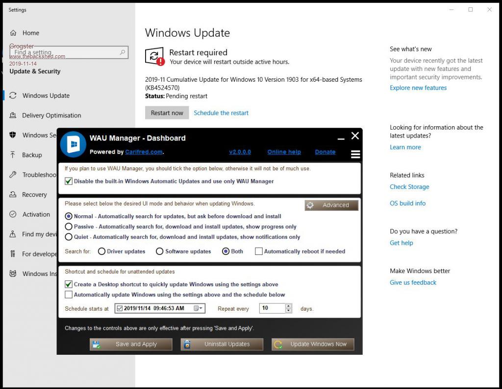 Bugger! ![]() As yet I've not noticed any of the several machines I've put WAU on do any updates - all benign. Maybe there was something in progress before you installed WAU. if so then that would complete. I guess we'll have to see what happens next... ![]() Fingers & toes crossed... B [EDIT} It might be that MS will still push any security related updates, but not any new feature versions... Can you advise what update was installed? Edited 2019-11-14 17:39 by BrianP |