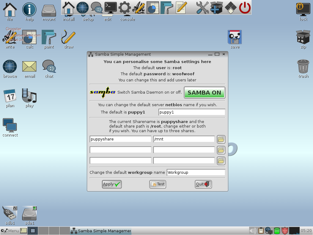 Hi Grogster, What puppy flavor does your setup refer to? D-pup 8.0 ? Not all puppies have samba, and you may need to install from repository (ibiblio). And then it does not come with the GUI, making setup more difficult. Volhout P.S. In puppy linux you are root as default. This may be a security issue, since you only rely on the samba password security. PicomiteVGA PETSCII ROBOTS |