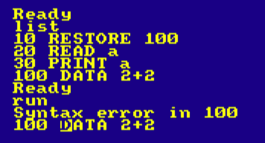 The reason why MMBasic allows expressions was simply because it was so easy to implement and there is no speed or compatibility impact if the elements are simple constants. In MMBasic the READ command uses the type of the variable in its argument list to determine if it is reading a string or a number. BTW, this was also discussed in this post. Geoff Geoff Graham - http://geoffg.net |