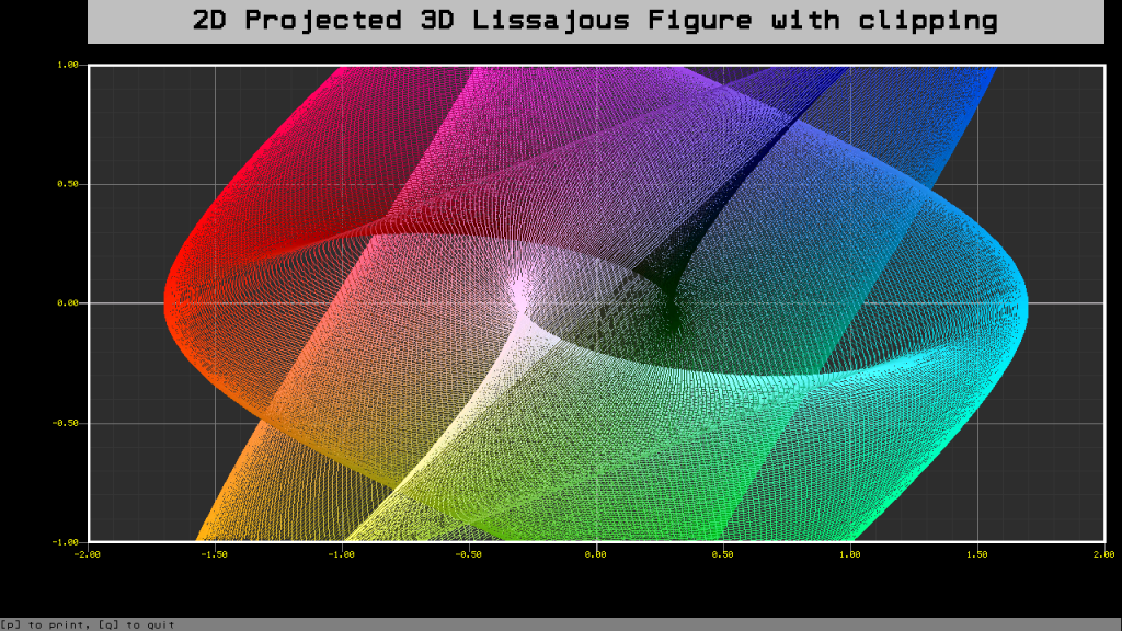Neat program. And more time spent figuring out "How he dunnit?" Although it does demonstrate that I must get my oscillator mod done. If you are going to 'Hmmmmpf' about this, perhaps a better change would be examine why the "IF" is there in the first place and determine how to remove it: Move -0.7, -0.7 FOR theta = 0.125 to 14400 step .125 ' ensures thick coverage of the figure x_3d = SIN(11.1*theta) ' calculate 3D lissajous points y_3d = SIN(11.125*theta) z_3d = COS(11.15*theta) x_2d = x_3d - .7*z_3d ' project them onto a 2D plane y_2d = y_3d - .7*z_3d Draw x_2D, y_2d, 2, (127*(1-z_3d) + ((127*(1-y_3d)) << 8) + ((127*(1-x_3d)) << 16)) NEXT theta Visit Vegipete's *Mite Library for cool programs. |