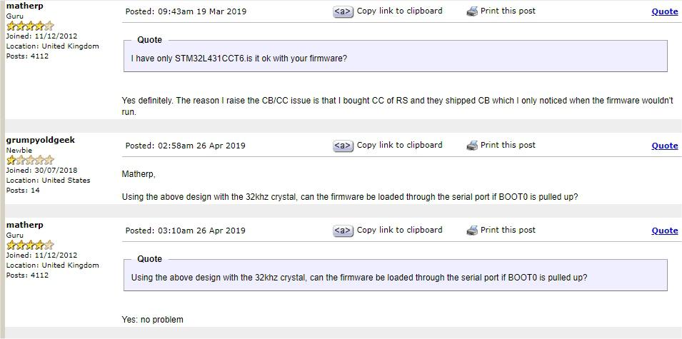 Re STM32L431CCT6, from this thread ![]() Now this doesn't specifically say "microbridge", and I haven't used this particular L4 (just the Nucleos), but it seems worth a try. One caveat--you're not likely to get much help with this module. ~ Edited 2020-11-03 09:11 by lizby PicoMite, Armmite F4, SensorKits, MMBasic Hardware, Games, etc. on fruitoftheshed |