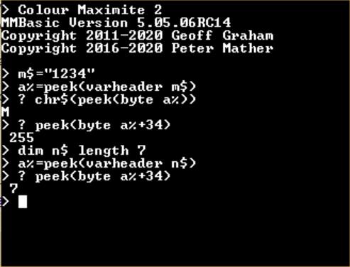 If you download V5.05.06RC14 again then you can try the following ![]() Remember the string has a length byte at the beginning so you need to move 1 byte more than the reported length I don't understand the sort request. Can you not do what you want by using the optional index and having two arrays? struct s_vartbl { // structure of the variable table char name[MAXVARLEN]; // variable's name char type; // its type (T_NUM, T_INT or T_STR) char level; // its subroutine or function level (used to track local variables) unsigned char size; // the number of chars to allocate for each element in a string array char dummy; int __attribute__ ((aligned (4))) dims[MAXDIM]; // the dimensions. it is an array if the first dimension is NOT zero union u_val{ MMFLOAT f; // the value if it is a float long long int i; // the value if it is an integer MMFLOAT *fa; // pointer to the allocated memory if it is an array of floats long long int *ia; // pointer to the allocated memory if it is an array of integers char *s; // pointer to the allocated memory if it is a string } } Edited 2020-11-07 21:06 by matherp |