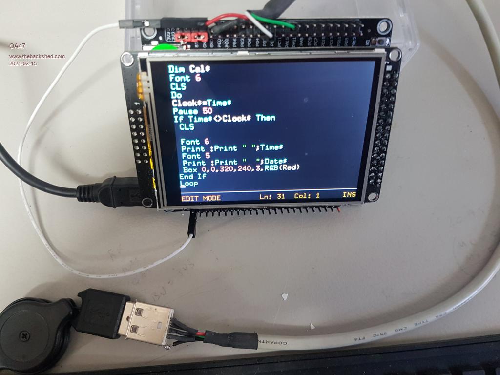 Thanks for the correction re USB keyboard to PS2 connections. I'll try this with a breakout board, but maybe not until tomorrow. Yes, STM32F407VET6 board. I don't think so for OPTIONs. It's the H7 manual--try it and see, then go back to the MM Plus manual, and then back to the Micromite manual. PicoMite, Armmite F4, SensorKits, MMBasic Hardware, Games, etc. on fruitoftheshed |