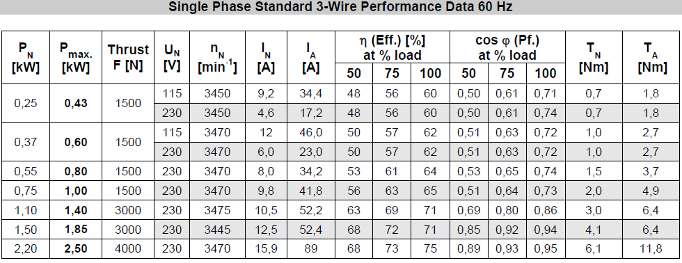 The table lists nominal power as 0.37kW and Pmax at 0.60kW