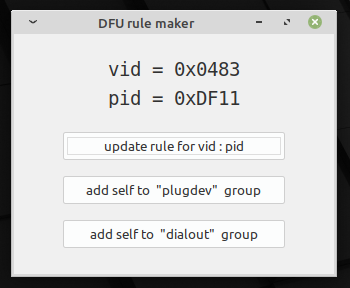 as promised, a small linux utility (32- and 64-bit) to create the rule for any DFU device, which also has buttons to adds the current user to plugdev or dialout groups: DFUfix (2022-01-04).zip just three buttons: 1. run the program, then plug in your STM32 device. the VID and PID displayed update whenever a device is plugged in, so you can plug in a 'black pill', then press the Boot0 and nRST buttons as required to reboot it into DFU mode. basically do whatever is needed until the right VID and PID are displayed. 2. press the top button and enter your password when asked. a new rule is created to allow members of the 'plugdev' group to access to the device. 3. press the middle button to add yourself to the 'plugdev' group - you will be prompted to enter your password again. 4. press the bottom button to... add yourself to the 'dialout' group. needed to access serial ports, as we have all discovered! ![]() the flashing asterix at the top left of the screen indicates that the dmesg utility is running in the background, which is how the utility knows when USB devices have been plugged in. full source code (lazarus 2.0.12) included in the archive. the 'interesting' code is in the files unit1.pas (the GUI program) and unit2.pas (console code to manipulate the rule file). the utility pkexec is used to gain root access when required, and should already be installed on most desktop distros. cheers, rob :-) Edited 2022-01-04 02:03 by robert.rozee |