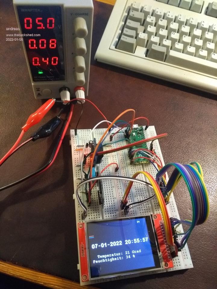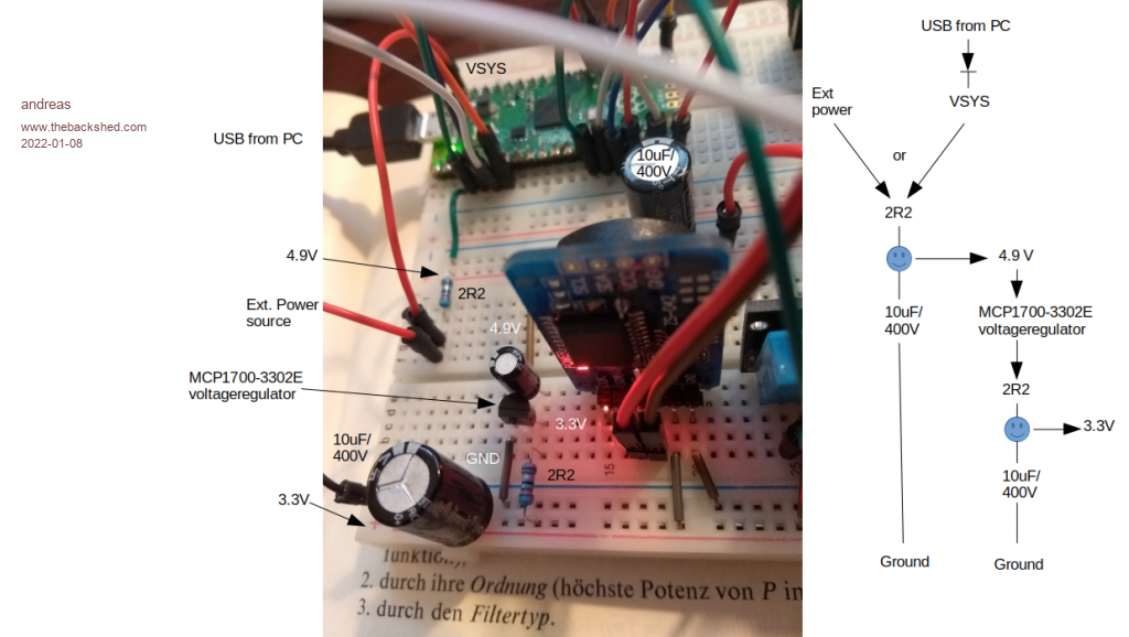 this is my setup. I have an LCD-screen, DHT sensor, RealTime clock and SDCard reader using a single power supply 5V. The 3.3V are generated by and voltage regulator on the breadboard. I have connected power to the VSYS pin of the pico.