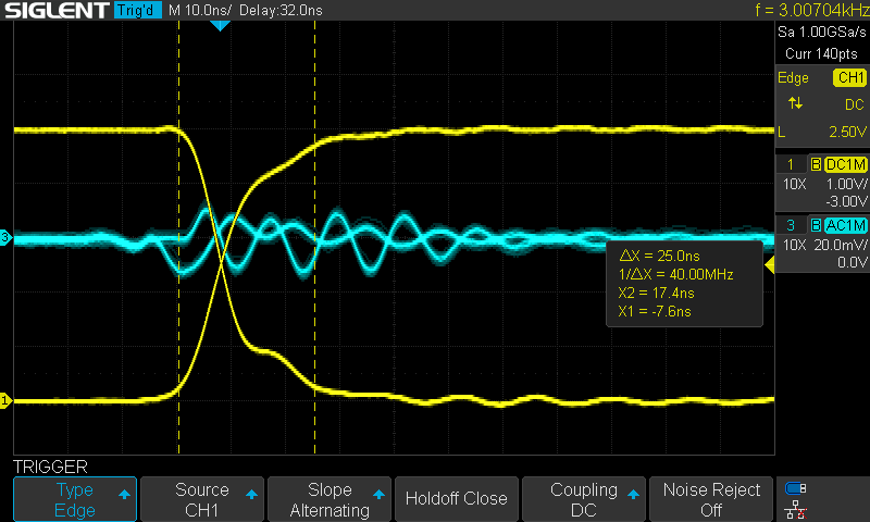 the cursors (dotted vertical lines) are set 25ns apart, or the equivalent of one 40MHz CPU clock cycle of the micromite. as can be seen (yellow trace), both the high-low and low-high transitions now complete within this time interval, and are fairly closely matched in slope. the result is better than i expected!