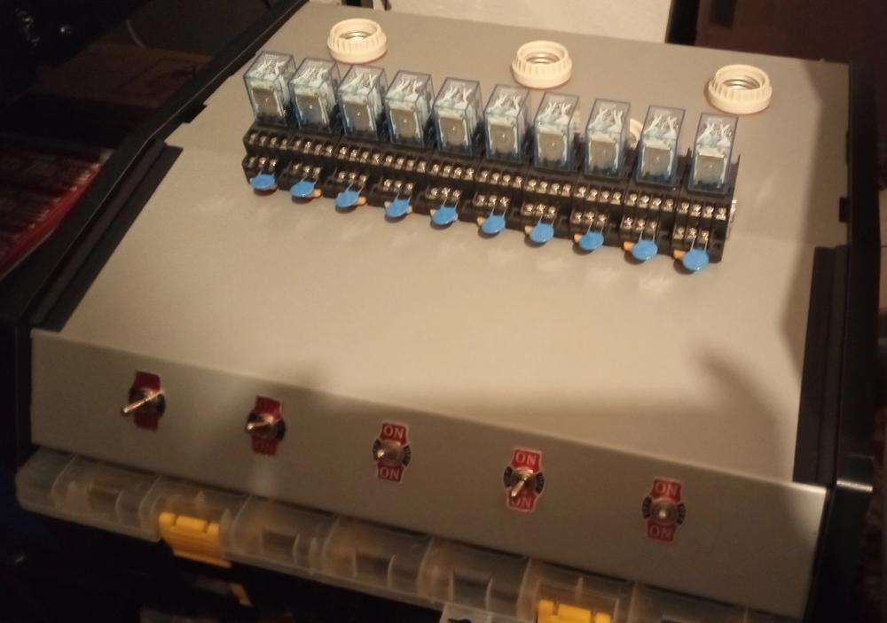 Have almost the same box. Tanner or sidewalk can't recall... Mine was already punched for some sort of 5 lightbulb demo. Figured with retro lamps I could maybe demo relay logic. Already upgraded front panel switches from SPST to SPDT. 2bits + 2bits + carry. Other controls still need to be drilled. Relay rail just sitting for the photo, not yet attached.