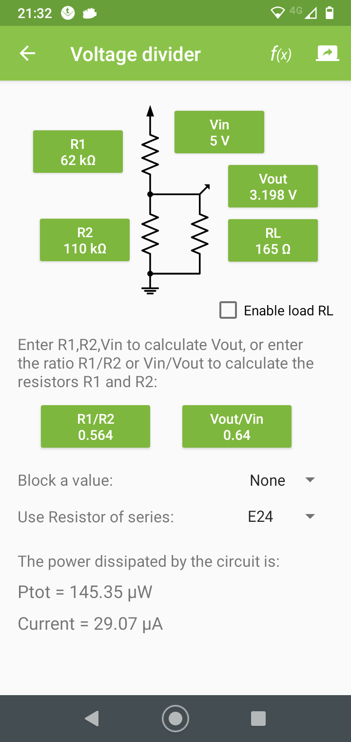 I doubt if the Pico input will load that with 165R! Try 3.3K on top and 6.8K on the bottom to give 3.366V off-load. The Pico input is pretty high resistance but that is safe and will drop a little further. Mick Zilog Inside! nascom.info for Nascom & Gemini Preliminary MMBasic docs & my PCB designs |
