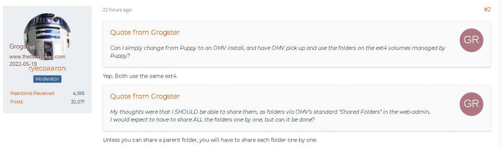 Thanks guys. ![]() @ Rickard5 - according to the OMV forums, you CAN simply swap volumes from another Linux, so long as they are also ext4. ![]() This suggests that I should be able to do this with no pain at all. If I move all the folders into one parent folder before I move the drive to OMV, then OMV should only require that I share that parent folder for it to work. Can you elaborate on the issue you obviously had with point #1 in your reply? Smoke makes things work. When the smoke gets out, it stops! |