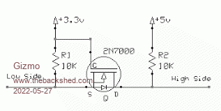 My X & Z axis use M325 microsteppers, and the big Y axis motor is using a DM432C microstepper. These require TTL level logic, a HIGH is 4-5 volts, so I'll add some level shifters to up the 3.3 volts from teh ESP32. I've been using this simple level shifter circuit ( http://techref.massmind.org/techref/logic/levelconversion.htm )...