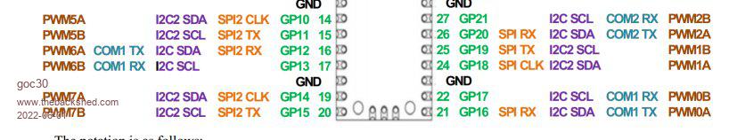 Ah - answered on the other thread. I hadn't spotted the double comma. Should have gone to ****Savers. :) Peter's right on this - it's the way the hardware works on the Pico. I know the RP2040 Datasheet is huge, but there's an immense amount of information in it and it's not as difficult to follow as you may think (most of the time!). Just avoid anything that says CPU or PIO on it. ;) I think the main confusion comes in that there are A and B channels on each PWM device. On each device the channels always have the same frequency but the duties are independent. SETPIN relates to a single channel A or B. PWM relates to the PWM device, both channels of it. Consequently, if you want to use A and B channels you need two SETPIN statements. Something that confused me at first. There are actually 8 PWM *devices* available - the frequencies are simply set for each device. It's not a choice of 8 frequencies - which was what I was expecting, coming from a background where the PWM frequencies were derived from a set of dividers. Mick Zilog Inside! nascom.info for Nascom & Gemini Preliminary MMBasic docs & my PCB designs |