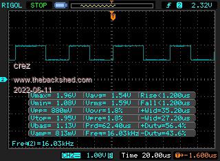 Output with new picomite version. No deviations above 1.96 or below 1.08 volts. Thanks Peter! If anything, it may be running a bit faster, but I wasn't paying particular attention to that.