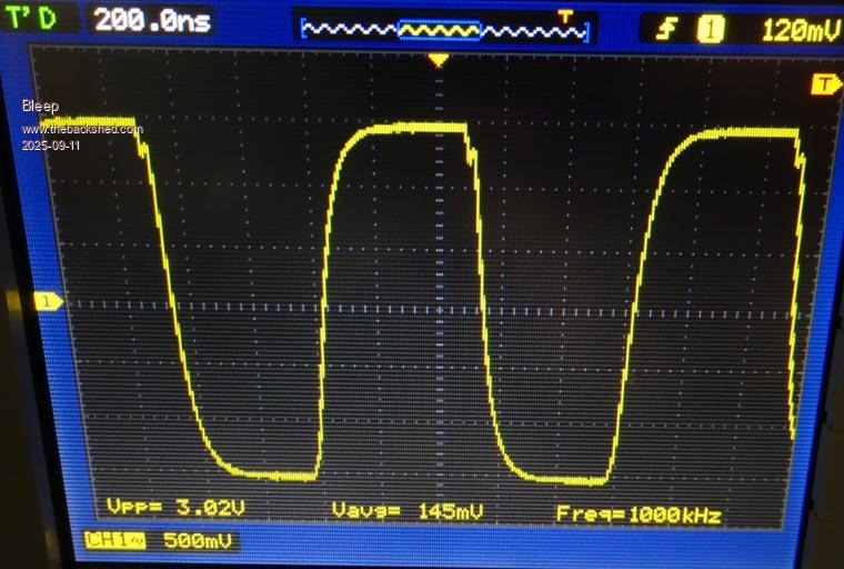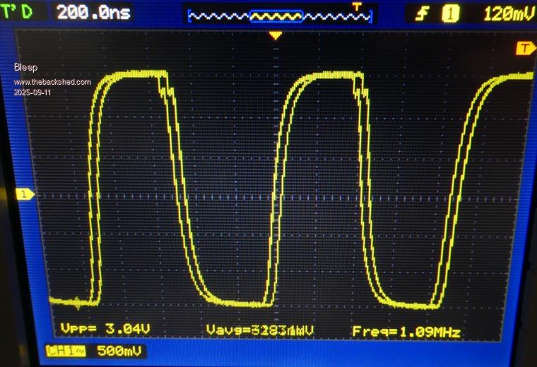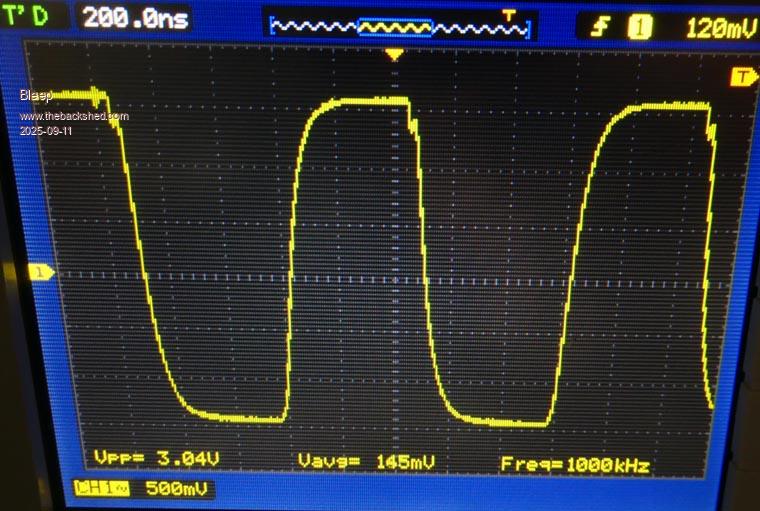 Hi Harm, I have modified as you suggested and it definately makes the Square wave better, presumably it was being over driven before. I changed my level to 18, because it gave me a 3V p/p square wave, which is the same as the Sine wave at 100%. If Mode<>LMode Then LMode=Mode If Mode=2 Then LLevel=Level Level=18 Else Level=LLevel EndIf EndIf I do find there is a strange 'jitter' on the square wave, for want of a better word, I assume it is to do with the crystal divider, though I still get a very slow change, about every second even if I select 1MHz, which I would think should be a perfect devisor frequency. If you look at the following 2 images, taken about 1 second apart, you can see that the falling edge moves, the rising edge is steady. This image is when I select 1.1MHz, which would be a devisor problem. Otherwise the Square is definately an improvement, Thanks. :-) Regards, Kevin. |