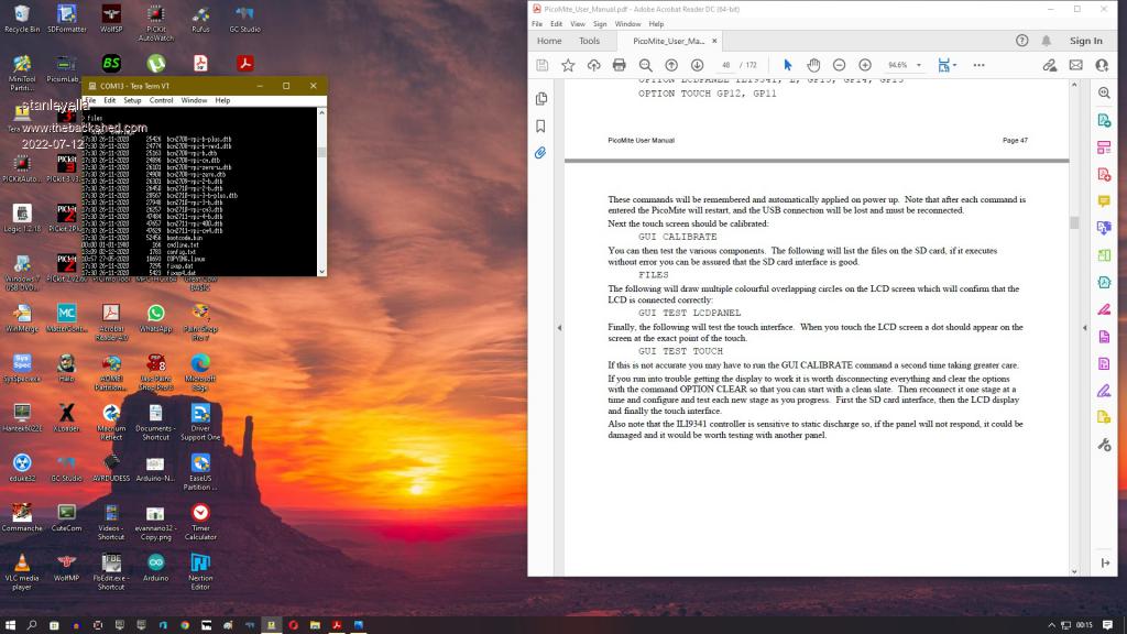"Where is any info for using sd card with ili9341 please? I mean the sd card slot on the ili9341" PicoMite User Manual V 5.07.04 Page 37 "Connecting a SD Card SD cards use the SPI protocol for communications and this needs to be specifically configured before they can be used. First the “system” SPI port needs to be configured. This is a port that will be used for system use (SD Card, LCD display and the touch controller on a LCD panel). There are a number of ports and pins that can be used (see the section PicoMite Hardware) but this example uses SPI on pins GP18, GP19 and GP16 for Clock, MOSI and MISO. OPTION SYSTEM SPI GP18, GP19, GP16 Then MMBasic must be told that there is an SD card attached and what pin is used for the Chip Select signal: OPTION SDCARD GP22" Using the above example SD_CS - GP22 SD_MOSI - GP19 - in parallel with display and touch SD_MISO - GP16 - ditto SD_SCK - GP18 - ditto |
