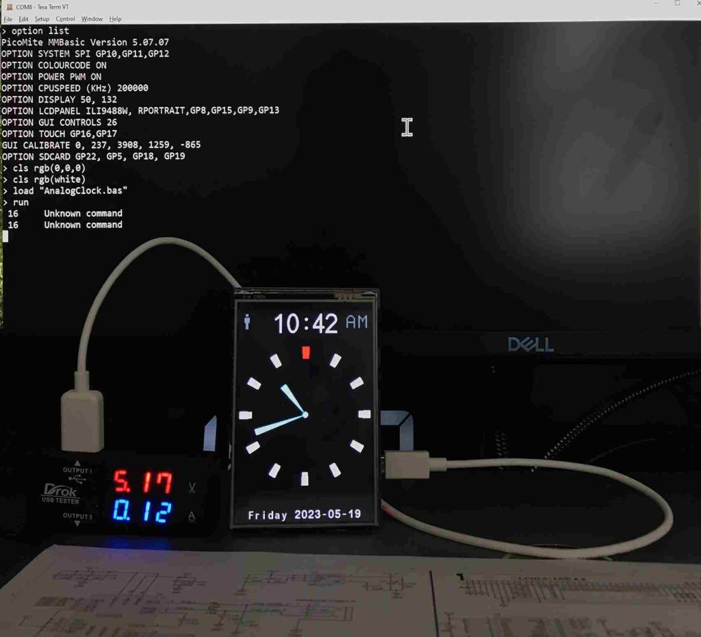 Hmmm - an interesting difference between the Pico and PicoW firmware, or my initialization for the WaveShare Pico-Eval-Board (P-E-B). Any thoughts? I have a Pico and a PicoW, and have two of the P-E-Bs. * The Pico will initialize, calibrate, and use the WaveShare touch capabilities just fine on both P-E-B assemblies. * The PicoW, though it uses most of the other peripherals just fine, fails to initialize the touch circuitry correctly on both. When I run GUI TEST TOUCH, the LCD display goes white, targets are *not* displayed, and it doesn't respond to me touching the screen. I have to exit the test with a Ctrl-C, which returns control to the terminal session, but does not clear the screen. Subsequent program execution (of the clock code, above) runs normally, not requiring a restart. Here is my OPTION LIST for the Pico (which works with the P-E-B touch, in either Portrait or Landscape mode): OPTION SYSTEM SPI GP10,GP11,GP12 OPTION COLOURCODE ON OPTION POWER PWM ON OPTION CPUSPEED (KHz) 200000 OPTION LCDPANEL ILI9488W, RLANDSCAPE,GP8,GP15,GP9,GP13 OPTION GUI CONTROLS 26 OPTION TOUCH GP16,GP17 GUI CALIBRATE 0, 237, 3908, 1259, -865 OPTION SDCARD GP22, GP5, GP18, GP19 Here is my OPTION LIST for the PicoW (which doesn't work in either Portrait or Landscape): [OPTION SYSTEM SPI GP10,GP11,GP12 OPTION COLOURCODE ON OPTION POWER PWM ON OPTION AUTORUN 4 OPTION HEARTBEAT OFF OPTION CPUSPEED (KHz) 200000 OPTION LCDPANEL ILI9488W, RPORTRAIT,GP8,GP15,GP9,GP13 OPTION DISPLAY 50, 132 OPTION WIFI MelodyGarden, ******** OPTION TOUCH GP16,GP17 GUI CALIBRATE 0, 3946, 211, -1287, 853 OPTION SDCARD GP22, GP5, GP18, GP19 and other info about the PicoW: Program:  6K ( 6%) Program (187 lines)  74K (94%) Free Saved Variables:  16K (100%) Free RAM:  6K ( 5%) 51 Variables  0K ( 0%) General 100K (95%) Free I found this when trying to enhance my analog clock program, above. Edited 2023-05-16 09:46 by NPHighview Live in the Future. It's Just Starting Now! |