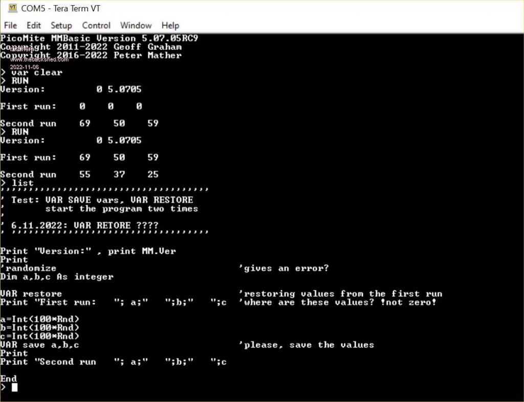 Just tested the program with firmware V5.07.05RC9 and on two different Pi Pico's. Found the same behavior as with V5.07.04. At the moment I have no idea how to use VAR SAVE/RESTORE.