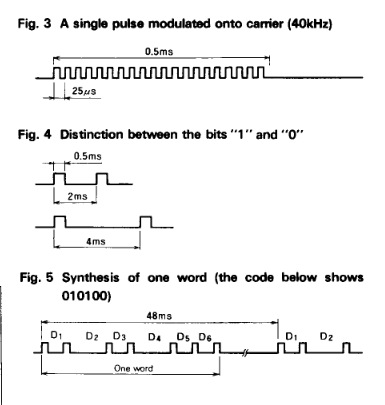I have a thing for 1980's "robots" and toys. I have x2 of these:- ![]() It is controlled via an IR remote. (It also has the capacity to have control sent via a serial port (at the back - which neither of mine have) - that will be phase II for me -- see if I can hack back in the serial control) x1 has a remote, the other doesn't. So I want to "clone" the working remote. Now the circuit inside the remove is simple - a diode and a M58480P chip -- so I could reverse engineer the circuit and build one (assuming I can get the IC) Chip details But, I can use the PicoMite and IR surely? I have a 40kHz IR receiver (plus a couple of 38kHz) on order to see if I can read out the codes sent by the working remote. If I cant get this via the PicoMite/IR I will fire up my oscilloscope to see if I can capture the signal / bit pattern directly. According to the data sheet, the IC uses a 40kHz carrier -- and 6 bit command words. I think I should be OK to read / decode the existing remote. But the PicoMite manual talks about 38kHz / 12bit for sending IR. Ok, so the built in "sending" doesn't look like it would work -- so time to roll my own. The datasheet talks about 2msec and 4msec intervals being a "0" and "1" -- so question: Can I modulate an IR diode fast enough to make "0" and "1", with each pulse being 25us << that's the big question I suppose. Any pointers on making a custom IR control? (Or can you buy remotes that just clone existing ones?) Cheers Nim Entropy is not what it used to be |