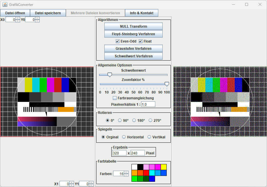 Hello, I have found the following tool: http://christoph.laeubrich.de/files/uploads/19/grafikkonverterv1_4.zip Detail here: https://www.mikrocontroller.net/topic/92623 or also here https://github.com/laeubi/grafikkonverter-tool Unfortunately you have to enter the 16 colors once as a palette at the beginning, this can also not be saved :-( Maybe someone can do something with the sources ... Results see attached. London extracted from the input post. The bird and a test picture of me ... ![]() ![]() ![]() ![]() ![]() ![]() |