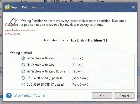 MiniTool Partition Wizard has a tool called WIPE DISK, and you can select from a few different options including fill with zeros, fill with one's, fill with alternate zeros and ones, 3-pass wipe and 7-pass wipe.