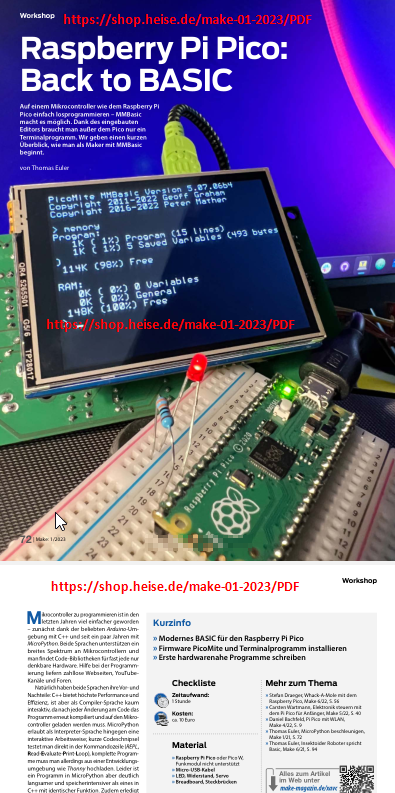 PiPico mmbasic in the "Make" in Germany Unfortunately only available for purchase. I have the magazine and was very happy about the article. Many greetings from Germany. https://shop.heise.de/make-01-2023/PDF I am only reader of the magazine, not to get problems all the links in the screenshot of the PDF! ![]() Edited 2023-02-10 08:10 by homa |