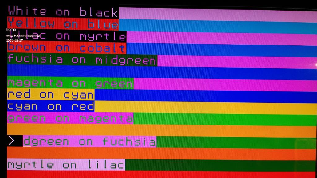 Specially for Volhout PicoMiteVGA.zip Try CLS TILE 0,0,0,RGB(white),80 TILE 0,1,0,RGB(yellow),80 TILE 0,2,0,RGB(lilac),80 TILE 0,3,0,RGB(brown),80 TILE 0,4,0,RGB(fuchsia),80 TILE 0,5,0,RGB(rust),80 TILE 0,6,0,RGB(magenta),80 TILE 0,7,0,RGB(red),80 TILE 0,8,0,RGB(cyan),80 TILE 0,9,0,RGB(green),80 TILE 0,10,0,RGB(cerulean),80 TILE 0,11,0,RGB(midgreen),80 TILE 0,12,0,RGB(cobalt),80 TILE 0,13,0,RGB(myrtle),80 TILE 0,14,0,RGB(blue),80 TILE 0,15,0,RGB(black),80 Text 0,0,"White on black",,,,RGB(white),RGB(black) Text 0,12,"Yellow on blue",,,,RGB(yellow),RGB(blue) Text 0,24,"lilac on myrtle",,,,RGB(lilac),RGB(myrtle) Text 0,36,"brown on cobalt",,,,RGB(brown),RGB(cobalt) Text 0,48,"fuchsia on midgreen",,,,RGB(fuchsia),RGB(midgreen) Text 0,60,"rust on cerulean",,,,RGB(rust),RGB(cerulean) Text 0,72,"magenta on green",,,,RGB(magenta),RGB(green) Text 0,84,"red on cyan",,,,RGB(red),RGB(cyan) Text 0,96,"cyan on red",,,,RGB(cyan),RGB(red) Text 0,108,"green on magenta",,,,RGB(green),RGB(magenta) Text 0,120,"cerulean on rust",,,,RGB(cerulean),RGB(rust) Text 0,132,"midgreen on fuchsia",,,,RGB(midgreen),RGB(fuchsia) Text 0,144,"cobalt on brown",,,,RGB(cobalt),RGB(brown) Text 0,156,"myrtle on lilac",,,,RGB(myrtle),RGB(lilac) Text 0,168,"blue on yellow",,,,RGB(blue),RGB(yellow) Text 0,180,"black on white",,,,RGB(black),RGB(white) Save image "B:/test" Pause 5000 MODE 2 Load image "B:/test" Do :Loop |