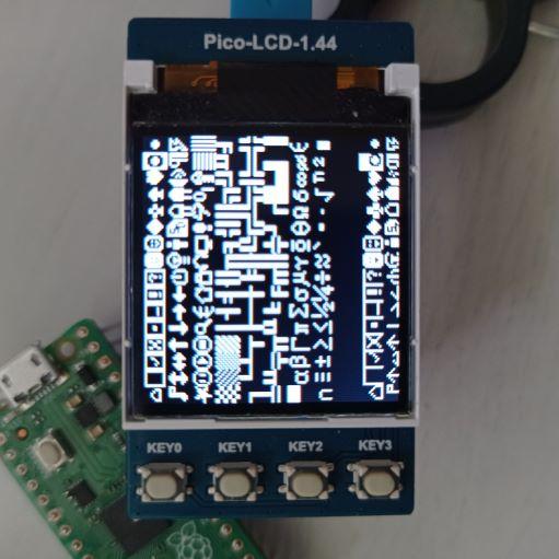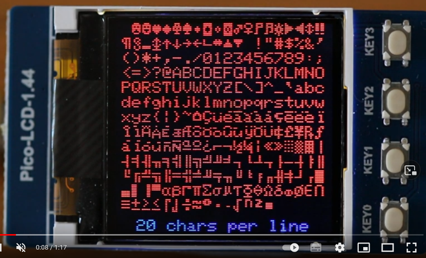 franzi said  Thanks. I had this working for one character at a time using Chr$(xxx), but am puzzled as to how I can create larger graphics using the extended character set. Tony Goodhew from the UK has posted a Youtube video showing a text and graphics workout for the Waveshare 1.44 LCD running uPython on a RPi Pico: