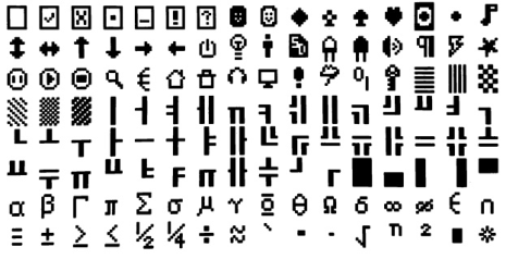 > for i=0 to 7:for j=0 to 15:text j*fw,i*fh,chr$(127+(i*16+j)):next:next