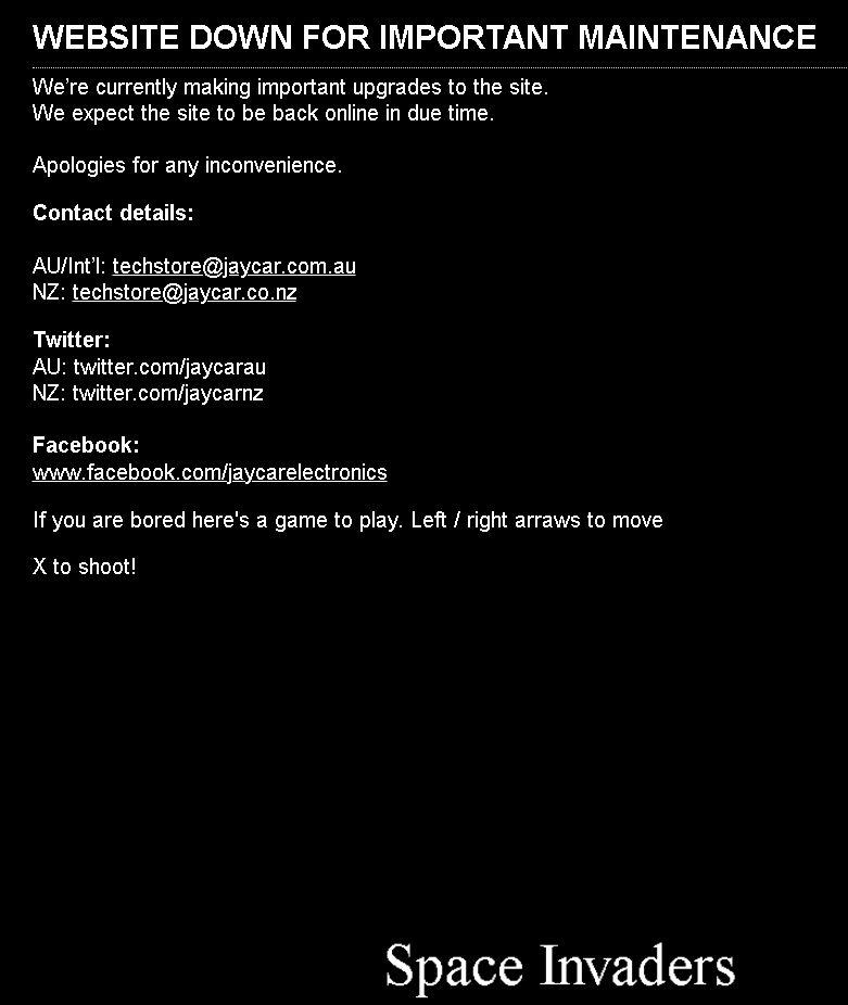 Go to either jaycar.co.nz or jaycar.com.au, and you will get a maintenance message, but scroll down a little and you can play a game of Space Invaders!