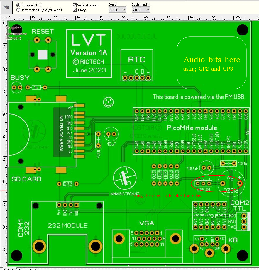Here are the gerbers and drill data in a ZIP file: Logging VESA Terminal(LVT) 1B.zip And here are links to all the parts other then the passives and the Pico module: PCB Stereo sockets... SD card sockets... Bi-directional level-corrector module.... RS232 module... RTC module... Tact switch(RESET)... 5v Piezo Beeper... PS/2 Purple Keyboard socket... Blue VGA female socket... I think that covers everything. Edited 2023-06-22 12:32 by Grogster Smoke makes things work. When the smoke gets out, it stops! |