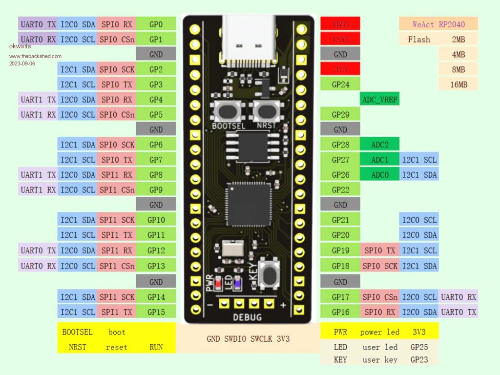 Oh yes! I hadn't spotted that they'd moved all the ADC inputs! Nope, sorry, WeAct - I wouldn't bother with that board. It breaks too many rules. I thought the YD-2040 was a bit out, but as I look at it more I think they made some good choices. I just with they'd used faster flash. Mick Zilog Inside! nascom.info for Nascom & Gemini Preliminary MMBasic docs & my PCB designs |