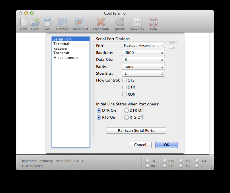![]() (from: https://www.mac-usb-serial.com/docs/tutorials/access-serial-port-on-mac-with-coolterm.html) can you confirm that NONE of the flow control check-boxes are ticked, and that "DTR On" and "RTS On" are both selected? cheers, rob :-) |