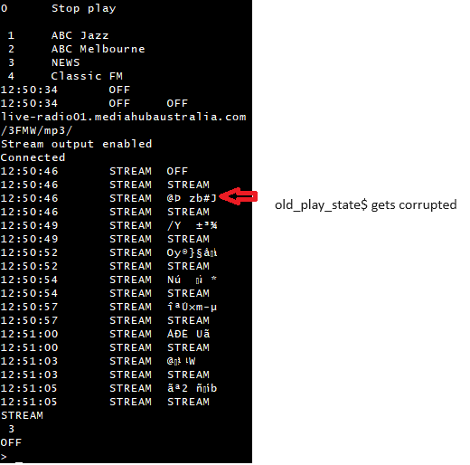 Every 3 seconds, a string variable old_play_state$ gets corrupted.