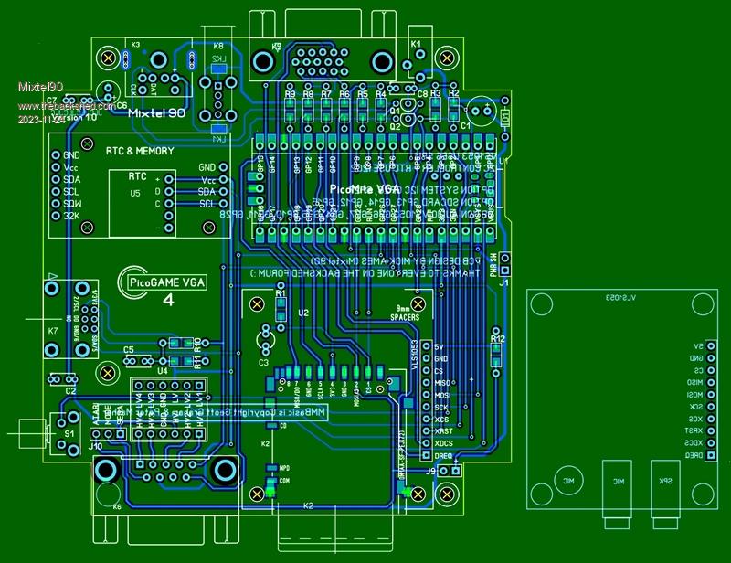 So, a new layout with the other version of the VS1053 module. The support pillars for the front edge of the VLS1053 are a bit too close for comfort to the SD card socket pads, but I think they'll be ok. You may get away with only fixing the rear edge anyway. The module is upside down as this puts the sockets at a more pleasing height. Getting rid of the rear audio socket has let me put the USB-A socket back, which I'm sure must be useful for a VGA-HDMI converter somewhere. Or for powering some speakers. It's powered off by the power switch on J1 if one is fitted. If you aren't a fan of Sega or Nintendo controllers you can swap link J10 to Atari, put a 10K resistor into J9 and use a normal Atari joystick. The fire button is on GP26. If you put a LED into J9 instead it will light every time you press Fire. :) Normally, with an LED in that position, it is lit by setting GP26 low. The Reset button S1 is an Omron B3F with the Omron cap on it. If used in the Hammond case it projects about 1.5mm, making a very neat and accessible button. It can be red too. :) This board probably won't be released until the new year. Ideally I'd like to get a WII socket and a VS1053 module to get proper measurements from before finalising the PCB. By then we'll be into the Christmas holidays etc. Edited 2023-11-24 23:50 by Mixtel90 Mick Zilog Inside! nascom.info for Nascom & Gemini Preliminary MMBasic docs & my PCB designs |