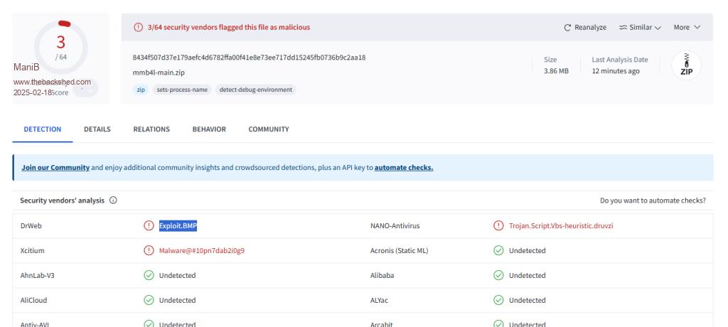 I checked your zipfile mmb4l-main.zip via VirusTotal and got this message: