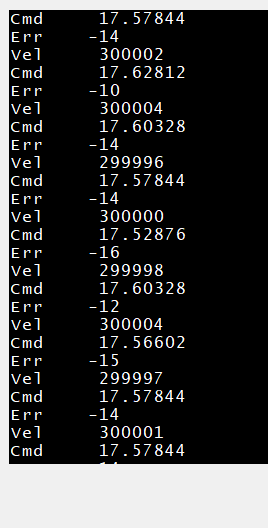 Well I wasn't anticipating (or needing) such fantastic performance. This has to be a world's first High performance closed-loop Position and Velocity control under interpreted Basic ArmMite H7 $5 LMD18200 H-Bridge module DC Motor with HEDS encoder. 500 line = 2000 quadrature counts/rev LS7366 SPI Quadrature decoder/counter ArmMite Basic Full Proportional-Integral-Derivative (PID) filter Integral limit Velocity Feed-Forward Acceleration Feed-Forward Torque Limiting Output Offset (to compensate for external influences, such as gravity) PID Loop rate: Currently 1ms (industry standard) but could easily handle 500us No "Sync" that we have in PicoMite Basic and so I profiled (surprisingly good): ![]() Velocity regulation is amazing, considering the simple H-Bridge: Command Velocity: 300,000 quad cts/sec = 150 revs/sec (2000 cts/rev) = 9000RPM ![]() Cmd: The PWM%. This is "Antiphase PWM", meaning that 50% duty-cycle is zero output to the motor. Err: Command_Position - Actual_Position. Velocity Feed-Forward (VFF) applied. Vel: Actual motor velocity in quadrature counts/sec. ![]() Steady state maintains zero position error. Force the motor shaft out of position or turn it with motor power (32V DC) off and it will jump right back. Now to implement Trapezoidal and S-curve velocity profiling, master/slave gearing and interpolation with other units This thing has all kinds of possibilities. |